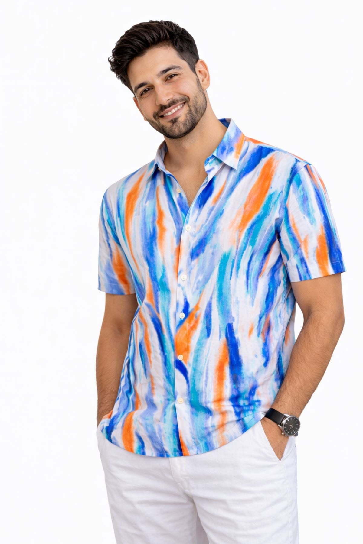 Fresh, fluid, and effortlessly stylish — the Asure Men Shirt is designed for modern western dressing with a relaxed yet elevated edge. Featuring a bold abstract print with fluid colour strokes, this shirt brings statement style while keeping the look refined and easygoing.