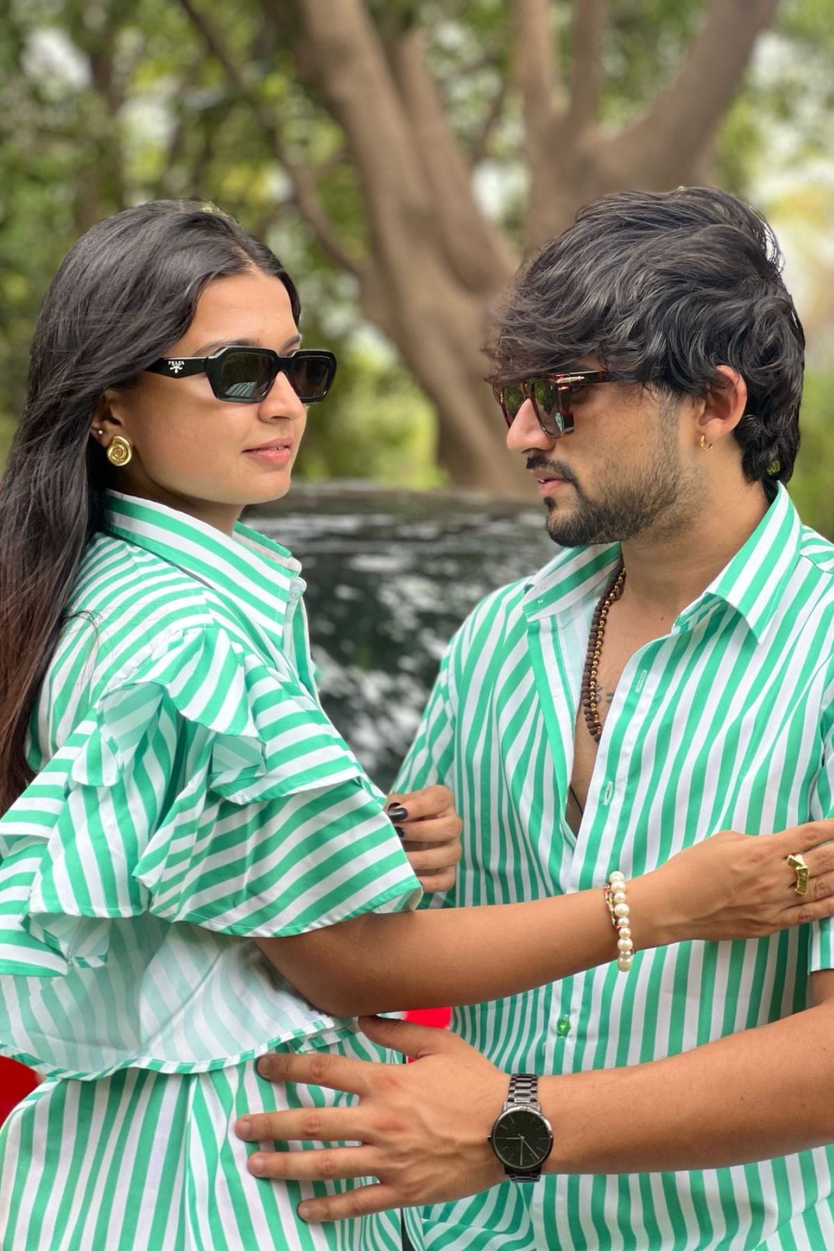 Bright, breezy, and full of charm – the Palm Traili dress for girls features crisp green and white vertical stripes and delicate handwork palm tree detailing near the hem, adding a fun tropical touch.